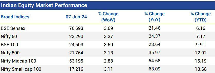 Domestic equity markets rebounded sharply as investors absorbed the Lok Sabha election results and shifted their focus to fundamentals and developments around government formation. Gains were extended after the RBI left the repo rate unchanged at 6.50% and revised the GDP growth rate of domestic economy upward to 7.2% from 7.0% for FY25.